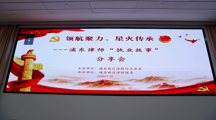 2020年7月29日中午,一場別開生面的“領航聚力、星火傳承---浦東律師“執業故事”分享會”,在上海市浦東新區圖書館黨建服務中心舉行。上海市浦東新區司法局黨組成員、副局長陳道友、上海市浦東新區律師行業黨委委員、浦東新區司法局律公處副處長張玥、副處長徐英姿、上海市浦東新區團委副書記萬添杰、上海市浦東律師團委書記韓璐、副書記張力偉、團委委員李旻、楊征東以及來自各事務所基層團組織的書記、副書記和優秀的青年律師代表們等出席了本次活動。