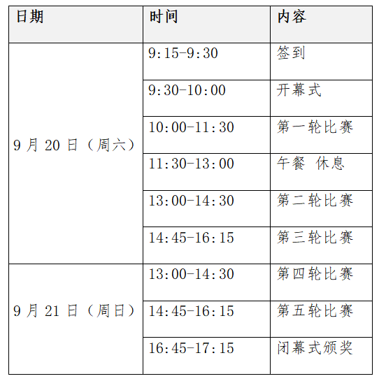 4.請參賽選手提前5分鐘到達比賽場地進行簽到和準備,每輪比賽遲到15分鐘視為該輪比賽棄權作負,棄權兩輪以上者視為退賽;