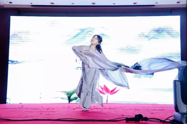在熱情似火的獨唱后,來自浦東新區的上海瀛泰律師事務所趙紅晴律師傾情獻上古典舞《霓裳》,舞姿優美,典雅柔情,如夢似幻的舞臺效果使臺下賓客無不沉醉其中,難怪詩人白居易曾贊嘆:“千歌萬舞不可數,就中最愛霓裳舞”。