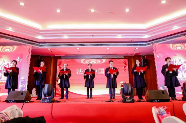 最后壓軸出場的是來自松江區的上海新松律師事務所、上海市誠至信律師事務所、上海保誠律師事務所、上海乾業律師事務所、上海豐兆律師事務所、上海朱平律師事務所帶來的詩朗誦《法治中國夢》。通過王麗、楊永偉、姚岑、王萍、張翕翊、張靜、朱言超等律師的傾情演繹,完美地呈現了女律師巾幗不讓須眉的恢弘氣勢,歌頌了女律師“柔肩擔道義”的情懷和擔當。