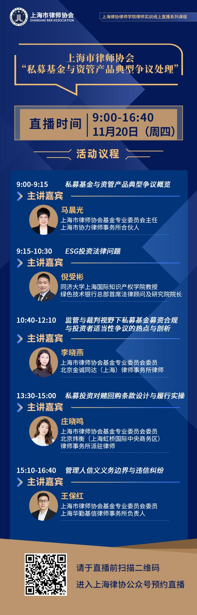 基于上述背景,上海律協律師學院聯合基金專業委員會共同主辦“私募基金與資管產品典型爭議處理”律師實務培訓班,聚焦“募、投、管、退”全生命周期高頻爭議場景,結合綠色投資、資管交叉投資等熱點話題,邀請專家及資深律師,系統梳理辦案技能與風險防控要點,助力律師在私募資管爭議解決領域提升專業能力和服務水平。具體安排如下: