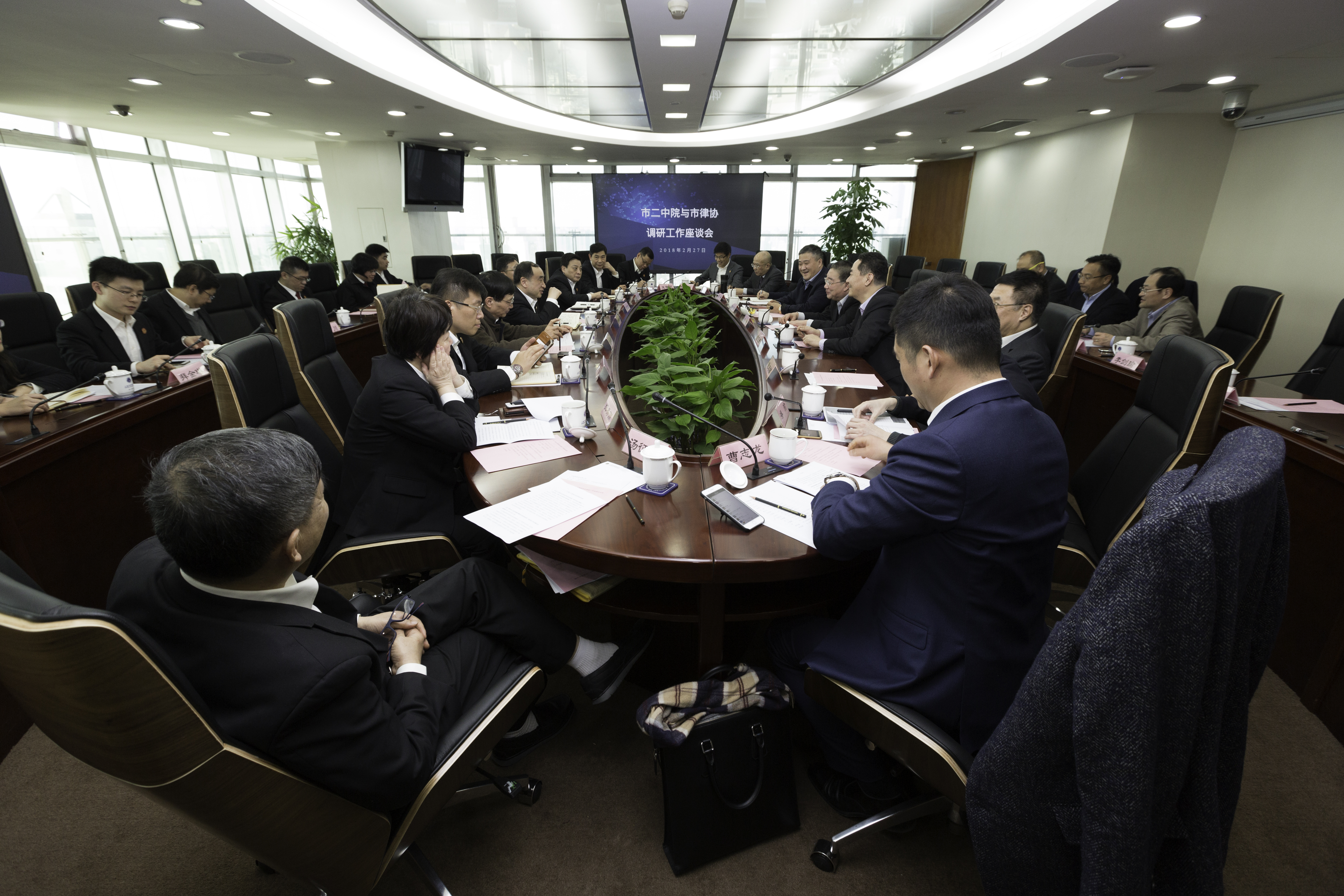 2018年2月27日下午,市二中院院長顧偉強,副院長阮忠良、宋學東,政治部主任谷開文及相關部門負責人等來到市律師開展大調研工作,并召開雙方2018年第一次工作例會。市司法局副局長、市律協黨委書記王協,市律協會長俞衛鋒,副會長潘書鴻,監事長錢翊樑,秘書長忻峰,副秘書長潘瑜及相關業務研究委員會主任、副主任等參加了座談。會議由俞衛鋒會長主持。