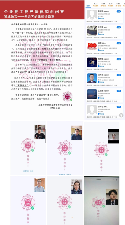 活動當天,奉賢律工委組織了近10名律師,通過“賢城法寶”微信小程序值班,為企業提供線上面對面的公益法律咨詢。“賢城法寶”是奉賢區司法局開發的微信小程序,并建立區內熱心參與公益的律師庫,方便企業和個人可以在這個程序上向值班律師咨詢,還可以通過留言咨詢,向任一入庫律師提出法律服務需求。