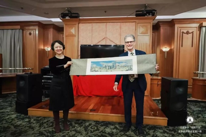 上海市律師協會外事委員會副主任史軍向Peter Groves贈送了中國文化意蘊濃厚的絲綢卷軸畫作為禮物,感謝講師的辛苦教學。