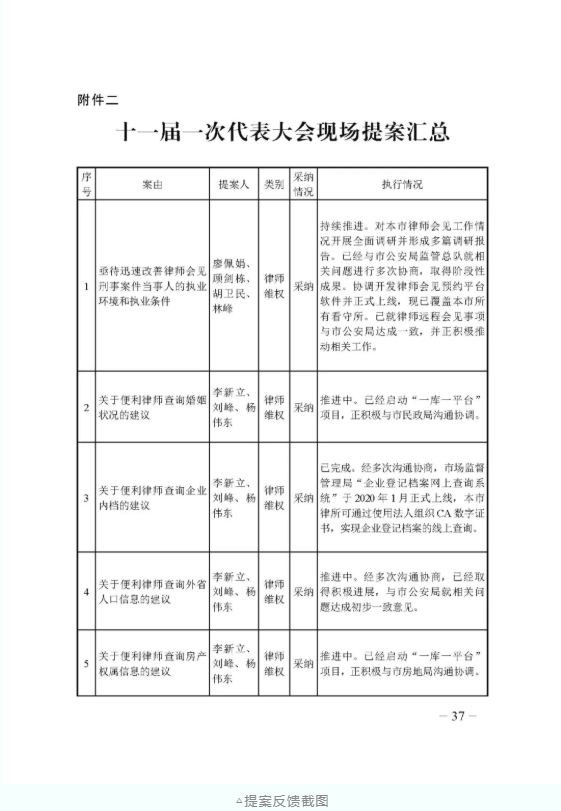 本次代表大會在理事會報告中以附件形式對十一屆一次代表大會現(xiàn)場提案情況作出書面反饋,對律師維權、代表大會、會員福利、經(jīng)費保障、職業(yè)培訓、宣傳表彰、機構設立、實習培訓等8類事項23件提案作出明確書面反饋,首次增加了推進落實情況的內(nèi)容,充分保障律師代表的民主權利,回應律師群體關心的問題。