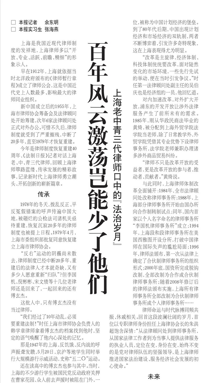 今年是律師制度恢復(fù)重建40周年,《法制日報(bào)》記者對話上海老、中、青三代律師,回顧上海律師篳路藍(lán)縷、傳承發(fā)展的精彩故事,記錄新時(shí)代上海律師勇立潮頭、開拓創(chuàng)新的嶄新篇章。