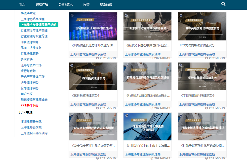 參展的156節(jié)課程已在“律師云學(xué)院”平臺(tái)專欄中集中展示,本市律師可登陸“律師云學(xué)院”平臺(tái),選擇“上海律協(xié)專業(yè)課程展示活動(dòng)”專欄中的課程進(jìn)行收聽(tīng)收看。