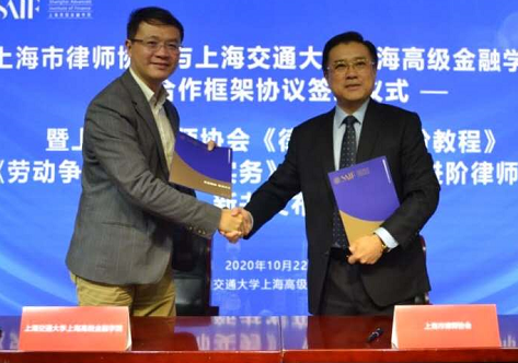 2020年10月22日上海市律師協會與上海交通大學高級金融學院合作框架協議簽約儀式在上海交通大學高級金融學院舉行。上海交通大學上海高級金融學院副院長,金融學教授、上海交通大學上海高級金融學院金融法治學科發展基金負責人、中國金融法治研究中心主任朱寧,上海律協會長、律師學院院長季諾,副會長楊波,副秘書長潘瑜以及業務部主任、律師學院教務長陳一沁出席簽約儀式。上海交通大學中國金融法治研究中心秘書長褚一樂主持。