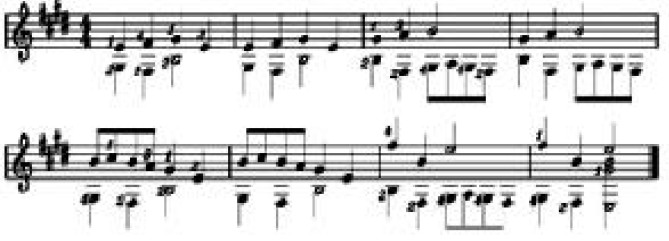“Counter Point”即“對位法”,是在音樂創作中使兩條或者更多條相互獨立的旋律同時發聲并且彼此融洽的技術。對位法是音樂史上最古老的創作技巧之一,是復調音樂的主要寫作技術,其曲譜圖形舉例如下: