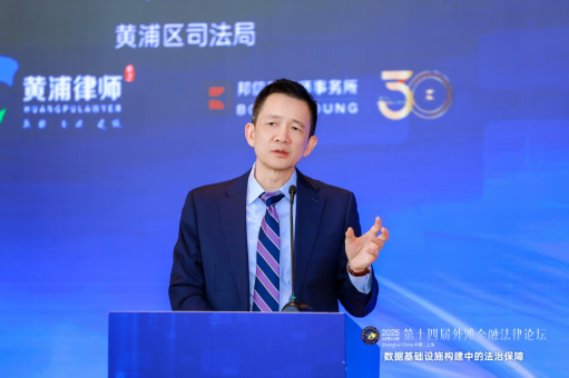 12月11日,第十四屆“外灘金融法律論壇”在新天地舉行。本屆論壇以“數據基礎設施構建中的法治保障”為主題,旨在凝聚共識,筑牢數據基礎設施的法治根基,推動數字經濟高質量發展。黃浦區委副書記、區長徐惠麗,市司法局黨委書記、局長顧全,上海財經大學校長、黨委副書記劉元春等出席論壇。黃浦區領導李銘、湯宏,上海市國際貿易促進委員會副會長、上海國際仲裁中心副主任馬屹,黃浦區人民檢察院檢察長談倩,市律師協會會長邵萬權,市、區有關部門負責人,企業界、法律界、學術界人士等參加論壇。