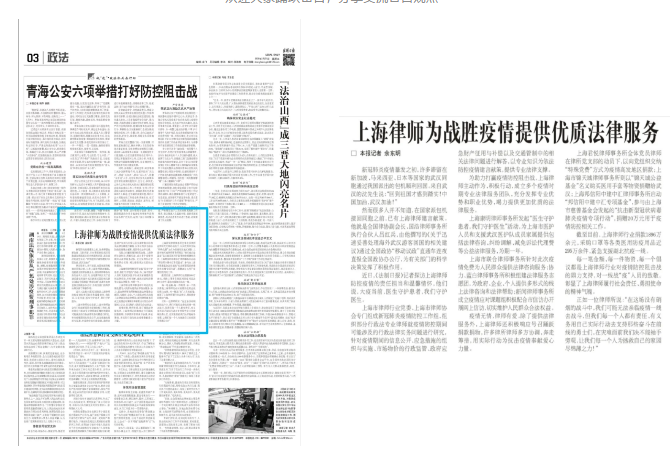 為助力打贏疫情防控阻擊戰(zhàn),上海律師主動作為、積極行動,成立多個(gè)疫情時(shí)期專業(yè)法律服務(wù)團(tuán)隊(duì),充分發(fā)揮專業(yè)優(yōu)勢和職業(yè)優(yōu)勢,竭力提供更加優(yōu)質(zhì)的法律服務(wù)。