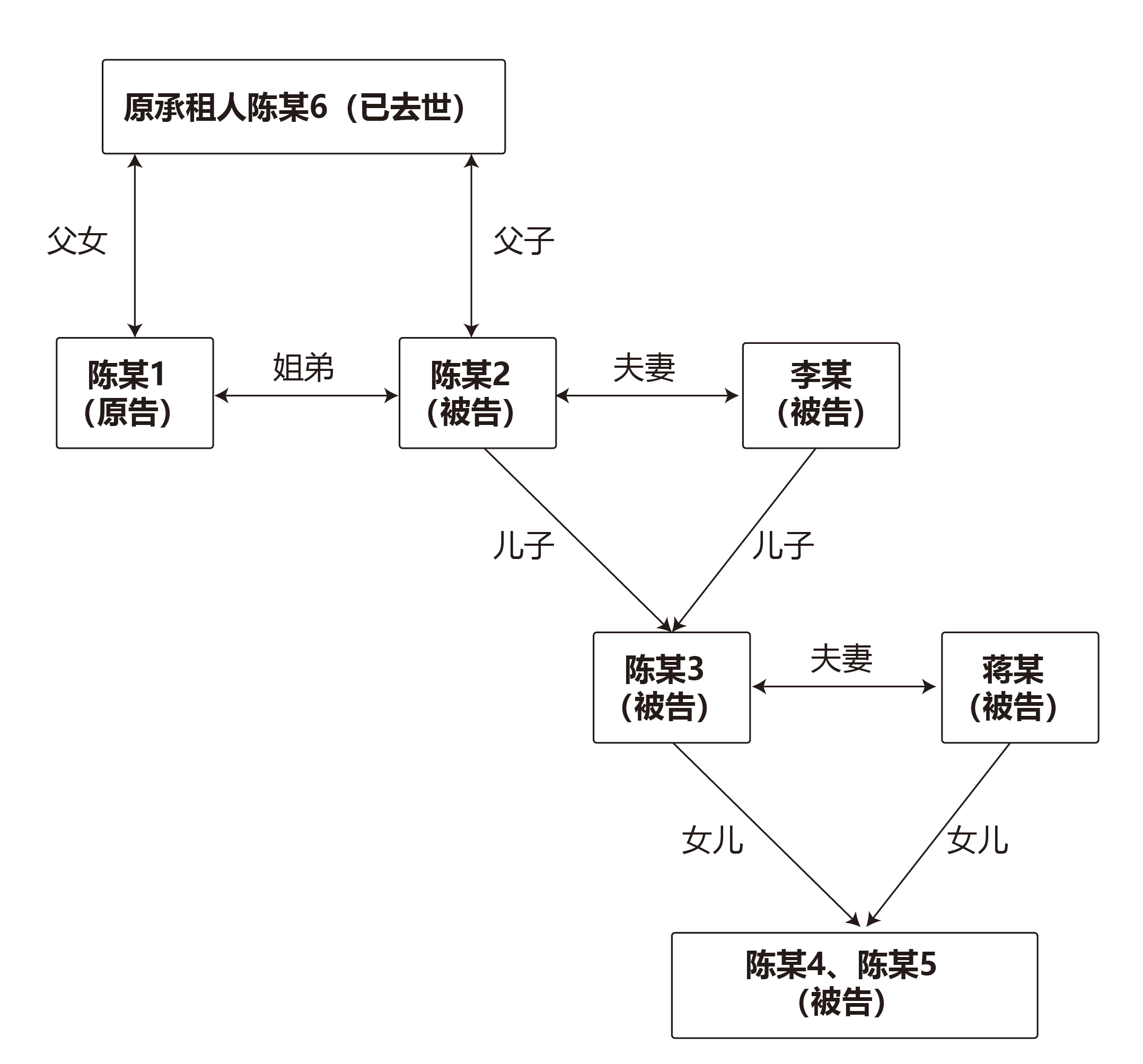 上海市涇東路某號房屋為公租房(下稱“系爭房屋”),原承租人陳某6于2014年去世。2015年,經家庭成員協商一致,承租人變更為陳某2。2017年6月,該房屋所在地塊被列入征收范圍,當時該房內有戶籍在冊人員7人,原告1人被告6人戶籍都在該房內。