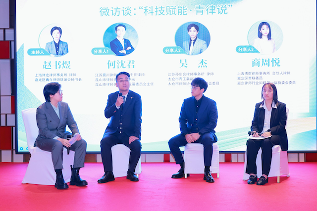 在隨后的 “科技賦能·青律說” 微訪談中,來自上海、昆山、太倉三地的青年律師商周悅、何沈君、吳杰,在主持人趙書煜律師的引導下,展開了一場跨區域的思維碰撞。他們從 “AI工具如何提升文書效率” 的實操細節,聊到 “青年律師如何平衡科技學習與業務成長” 的現實困惑,再到對 “三地律所聯動探索數字服務” 的無限憧憬,展現了新一代法律人的前沿思考與蓬勃活力。