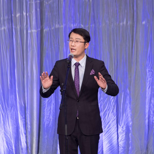 緊接著上場(chǎng)的是京劇社的社長(zhǎng)錢麗萍律師,他和寇樹才律師合作了老生名劇《文昭關(guān)》。錢社長(zhǎng)是京劇社唯一的坤生,大段的二黃成套唱腔、如泣如訴,將“伍子胥”愁悶的心情展露無(wú)遺,臺(tái)下觀眾也情不自禁地小聲哼唱,沉浸在美妙的藝術(shù)享受之中。而配演“東皋公”的寇樹才律師雖是首次彩唱,但唱得有板有眼、字正腔圓,顯然是經(jīng)過(guò)名家指點(diǎn)且下過(guò)一番功夫的。一問(wèn)才知,原來(lái)他是奚派名家張建國(guó)先生的入室弟子,果然法度嚴(yán)謹(jǐn)。