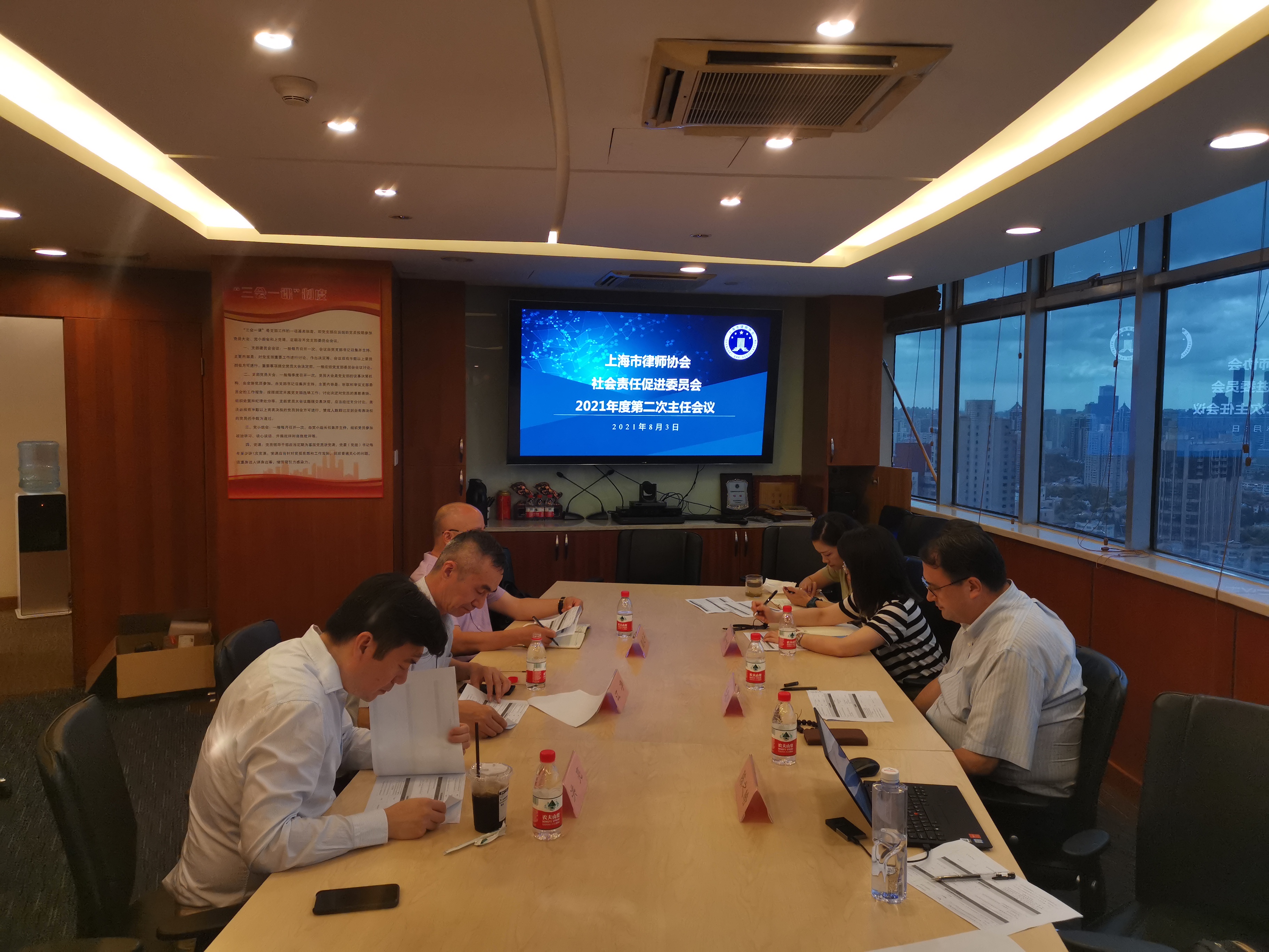 2021年8月3日下午,上海律協社會責任促進委員會2021年第二次主任工作會議在上海律協第五會議室召開。上海律協社會責任促進委員會主任毛惠剛,副主任洪亮、江凈、魏建平,秘書陳之皓,業務部主任陳一沁等出席了本次會議。