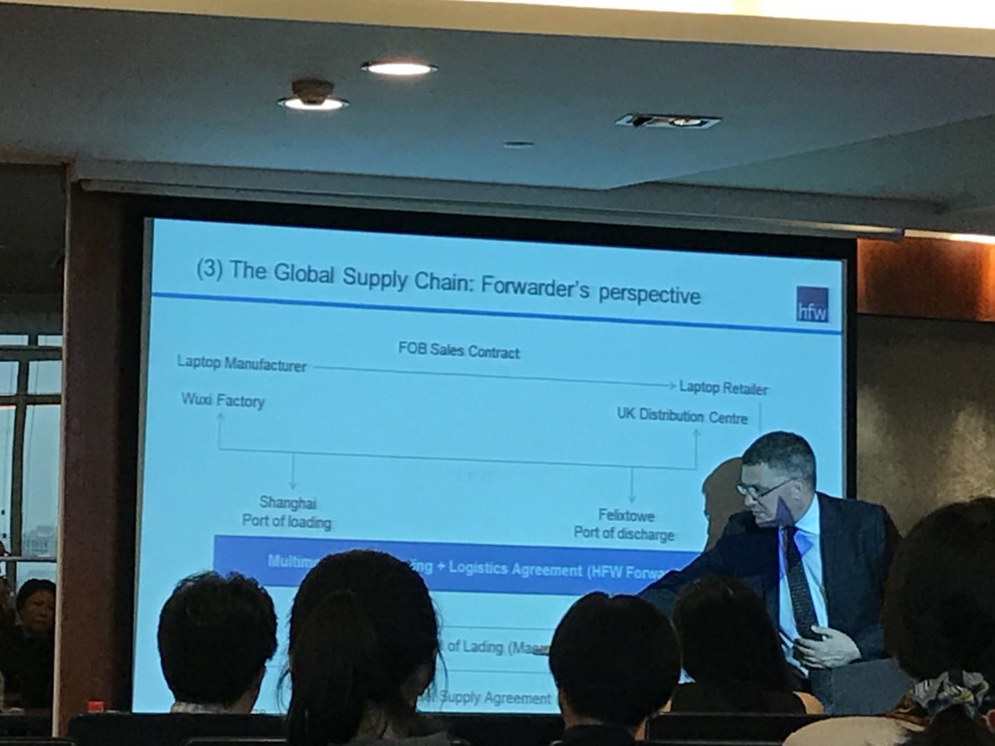 會議伊始,Nicholas Poynder向與會律師講解了英國法下FOB和多式聯運兩種不同運輸方式中發生貨損時,貨運代理人、承運人和多式聯運經營人的不同責任承擔,并且就中英兩國在相關問題上的不同點與在座律師進行了交流。