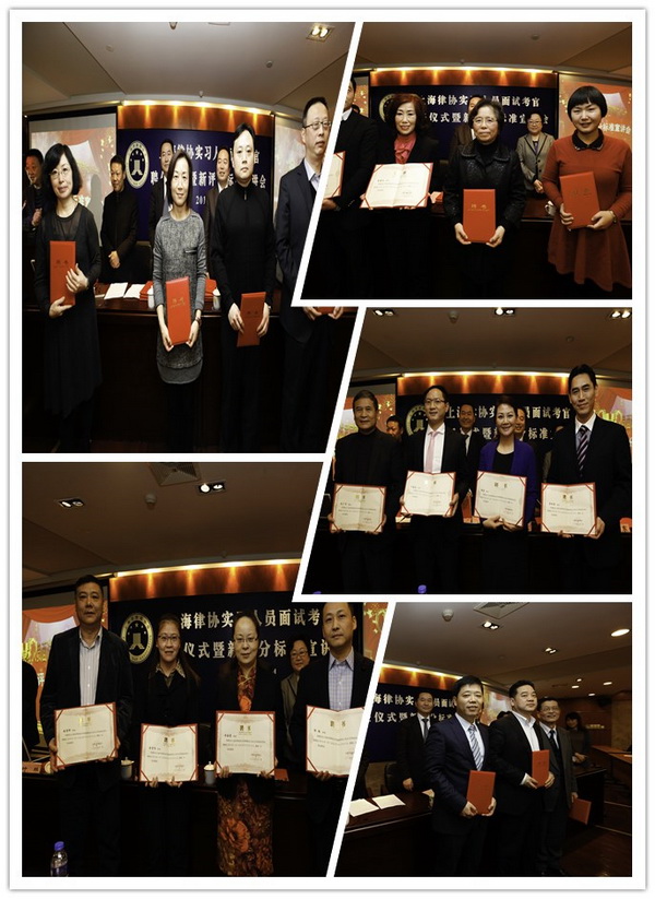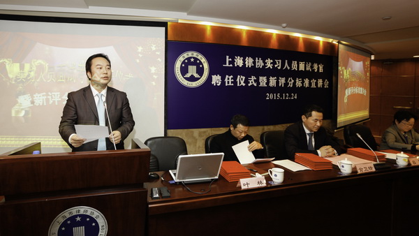 為感謝律師考官們對市律協工作的支持與理解,上海律協于2015年12月24日,在35樓報告廳舉行首次實習人員面試考官聘任儀式。市律協會長俞衛鋒、副會長兼考核委主任呂琰、市司法局律管處副處長葉林、市律協副秘書長陳東出席儀式。