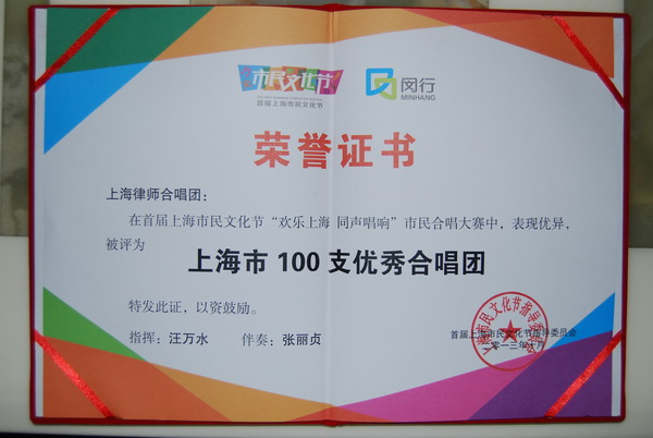 2013年11月3日晚,上海奔馳梅賽德斯文化中心,正在舉行上海市首屆市民文化節,“歡樂上海,同聲唱響”合唱大賽的展演活動,上海律師(大成)合唱團,作為大賽評出的101支歌隊,參加了上萬人的演唱。