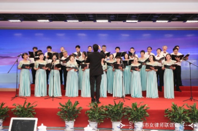 來自上海市律師合唱團的律師們走上舞臺齊聲合唱《我和我的祖國》,歌聲激揚回蕩,更有袁方、高鵬兩位律師的男女聲二重唱《共和國之戀》,用歌聲傳遞上海律師對于祖國母親深沉的愛。