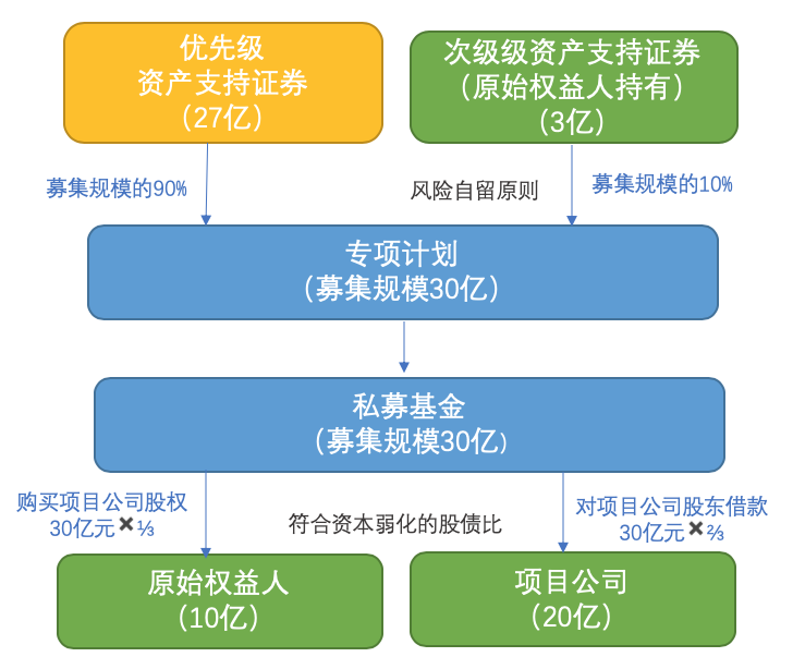 (5)、私募基金收到的實繳出資分為兩部分,一是原始權益人自有出資的首期實繳,二是專項計劃全部剩余金額的實繳,兩部分總額為30億元。私募基金將上述30億元實繳出資款項用于(a):收購項目公司100%股權;(b)向項目公司發放股東借款。為符合資本弱化的限制,私募基金向項目公司投資的股債比通常設置為1:2的小股大債模式。通過以上交易安排設置,專項計劃30億元募集款項通過私募基金最終全部流至原始權益人及項目公司。