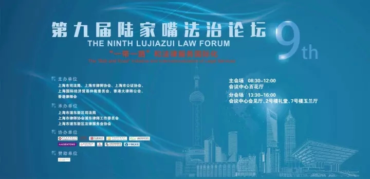 2017年11月18日,由上海市司法局、上海市律師協會、上海市公證協會、上海國際經濟貿易仲裁委員會、香港大律師公會、香港律師會聯合主辦,上海市浦東新區司法局、上海市律師協會浦東律師工作委員會、上海市浦東新區法律服務業協會承辦,并由多家律所協辦的第九屆陸家嘴法治論壇在上海西郊賓館會議中心舉行。