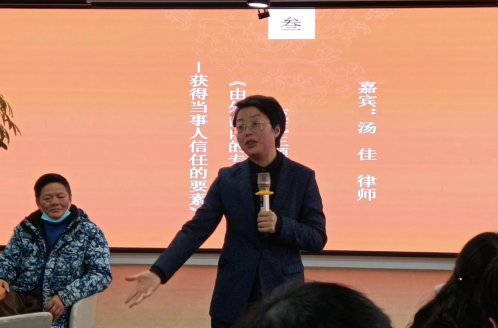 隨后,湯佳律師以《由外而內的專業展示—獲得當事人信任的要素》為題與青年律師進行交流。湯律師從各方面、多視角解析了“客戶的分類;接觸客戶的執業素養與行為舉止;如何獲取展現自信和專業水平”等青年律師面對客戶時的疑難問題,并現場教學、一對一指導在場青年律師如何更好地得到客戶信任,增加成案率,為青年律師開闊了視野,提供了很好的經驗指引。