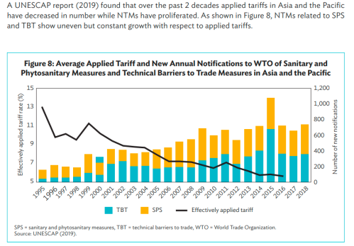 上圖來(lái)自亞洲發(fā)展銀行,可見自1995年以來(lái)的二十多年間,亞太地區(qū)關(guān)稅措施逐年下降,但非關(guān)稅措施在逐年上升。非關(guān)稅措施中主要部分是技術(shù)措施,WTO將技術(shù)措施分為兩類,保護(hù)人和動(dòng)植物健康的SPS協(xié)定,以及一般性技術(shù)規(guī)范的TBT協(xié)定。按WTO約定,只有為了保護(hù)健康,才可以設(shè)定比國(guó)際標(biāo)準(zhǔn)高的國(guó)內(nèi)標(biāo)準(zhǔn)。實(shí)際上,各國(guó)都用技術(shù)措施設(shè)定壁壘,保護(hù)本國(guó)相關(guān)產(chǎn)業(yè),因?yàn)檫@比關(guān)稅措施更隱蔽。消除技術(shù)壁壘是建立國(guó)際貿(mào)易自由的必然要求。