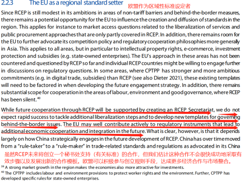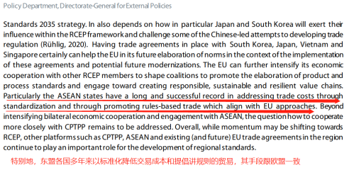 4.2 協(xié)調(diào)各國(guó)標(biāo)準(zhǔn)的主導(dǎo)權(quán):在制訂規(guī)則,協(xié)調(diào)各國(guó)規(guī)則之間起主導(dǎo)作用,這是有實(shí)力的國(guó)家要爭(zhēng)取的,我國(guó)有中國(guó)標(biāo)準(zhǔn)2035戰(zhàn)略,日本和韓國(guó)也有相應(yīng)計(jì)劃。不僅RCEP成員國(guó)想爭(zhēng)取制訂標(biāo)準(zhǔn)的主導(dǎo)權(quán),歐盟也很感興趣。由于東盟內(nèi)部標(biāo)準(zhǔn)協(xié)調(diào)工作是由歐盟輔助的,相關(guān)辦法跟歐盟是一致,歐盟甚至有處理問(wèn)題的模板。歐盟判斷,RCEP協(xié)調(diào)各國(guó)標(biāo)準(zhǔn)的工作不會(huì)很快完成,目前連協(xié)調(diào)標(biāo)準(zhǔn)的委員會(huì)都沒(méi)成立,必然要使用現(xiàn)成的模板解決標(biāo)準(zhǔn)協(xié)調(diào)問(wèn)題,使得歐盟在RCEP標(biāo)準(zhǔn)協(xié)調(diào)問(wèn)題上已經(jīng)處于優(yōu)勢(shì)地位。下圖是歐盟的報(bào)告。
