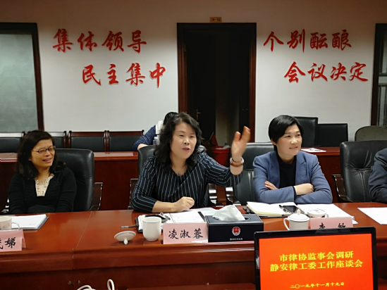 靜安區(qū)司法局局長凌淑蓉、副局長李敏、專業(yè)服務業(yè)管理科科長程茂娣,市律協(xié)靜安律工委主任王昊東及靜安律師代表參加了座談會。
