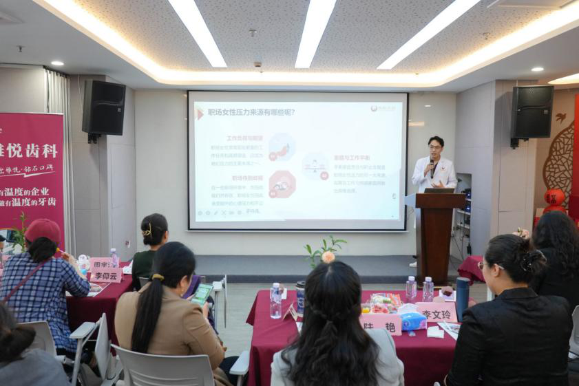 隨后,專業(yè)的齒科專家登上講臺(tái),為大家?guī)砹艘粓?chǎng)生動(dòng)實(shí)用的牙齒健康知識(shí)講座。專家聚焦職場(chǎng)中常見的齲病、磨牙、牙周炎等問題,深入剖析了壓力與口腔健康之間的微妙關(guān)聯(lián),并傳授了一系列實(shí)用的護(hù)齒減負(fù)技巧,助力在場(chǎng)女性同胞守護(hù)自信笑容,以更加精致的形象從容應(yīng)對(duì)職場(chǎng)與生活的雙重挑戰(zhàn)。