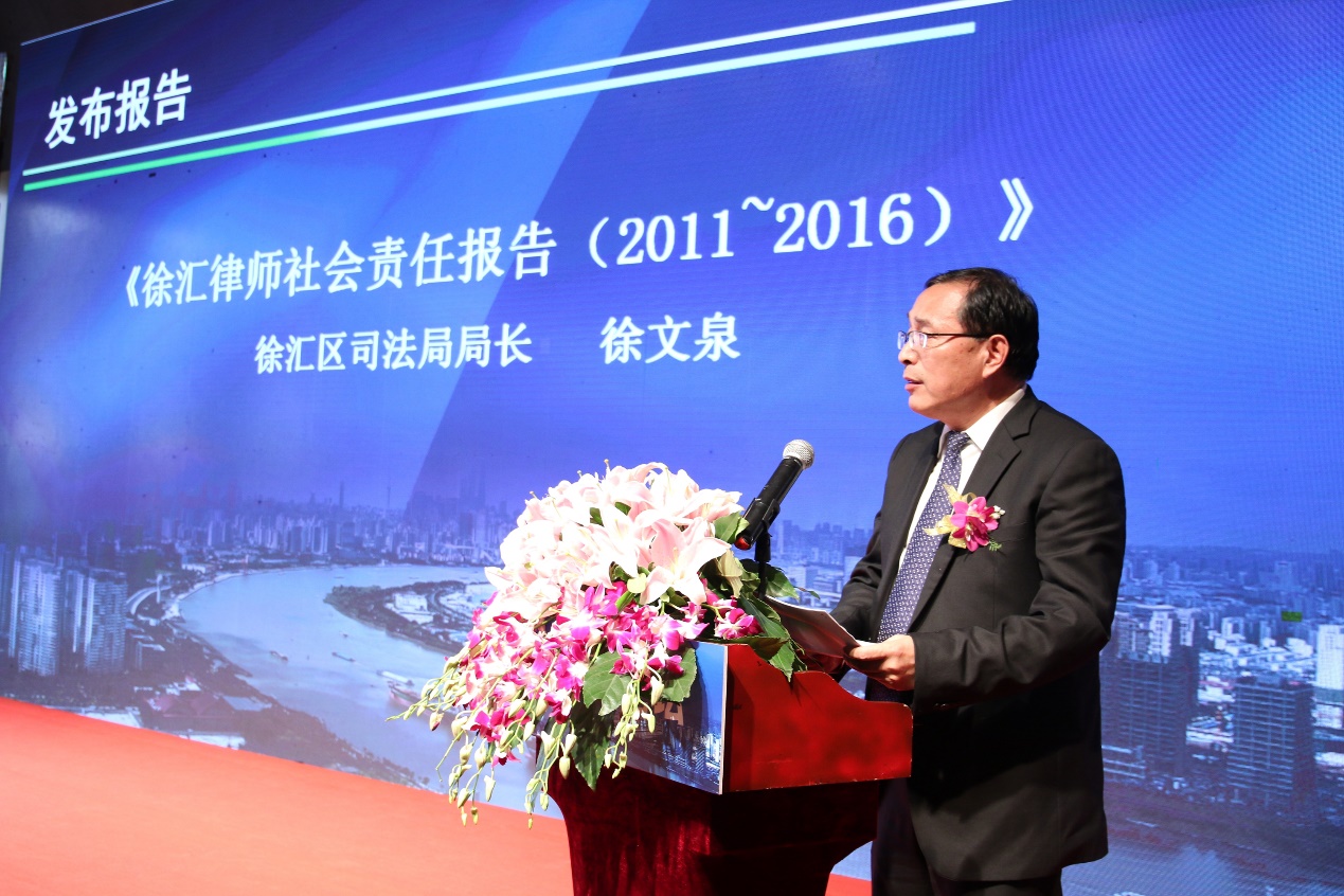 隨后,徐匯區司法局黨委書記、局長徐文泉發布了《徐匯律師社會責任報告》(2011-2016),這是徐匯區繼2009年首次發布律師社會責任報告后第二次發布相關報告。此次報告篇幅約四萬字,跨度為2011年1月1日至2016年9月31日,內容從徐匯律師參政議政、化解社會矛盾、保障民生生活、創新社區治理、參與多元調解和加強法制宣傳六個方面全面展示律師積極履行社會責任,匡扶弱勢群體合法權益、維護社會公平正義、服務回報社會的形象。