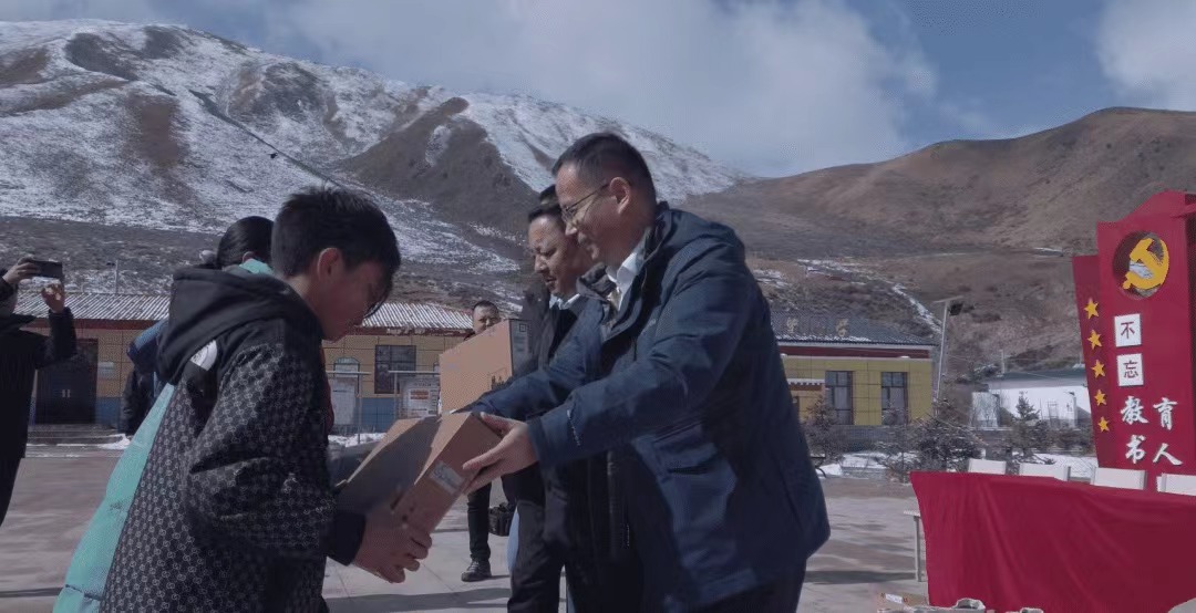 3月2日一早,虹口援青干部、瑪沁縣委副書記、副縣長黃捷,瑪沁縣委常委、統戰部長尕桑扎西,瑪沁縣檢察院檢察長房斌等一行不畏大雪封山,跋涉三個多小時將捐贈物資送到學校。虹口區司法局副局長胡曉紅,光大所合伙人、副主任吳海,合伙人、黨支部委員侯杰在線參與捐贈儀式。
