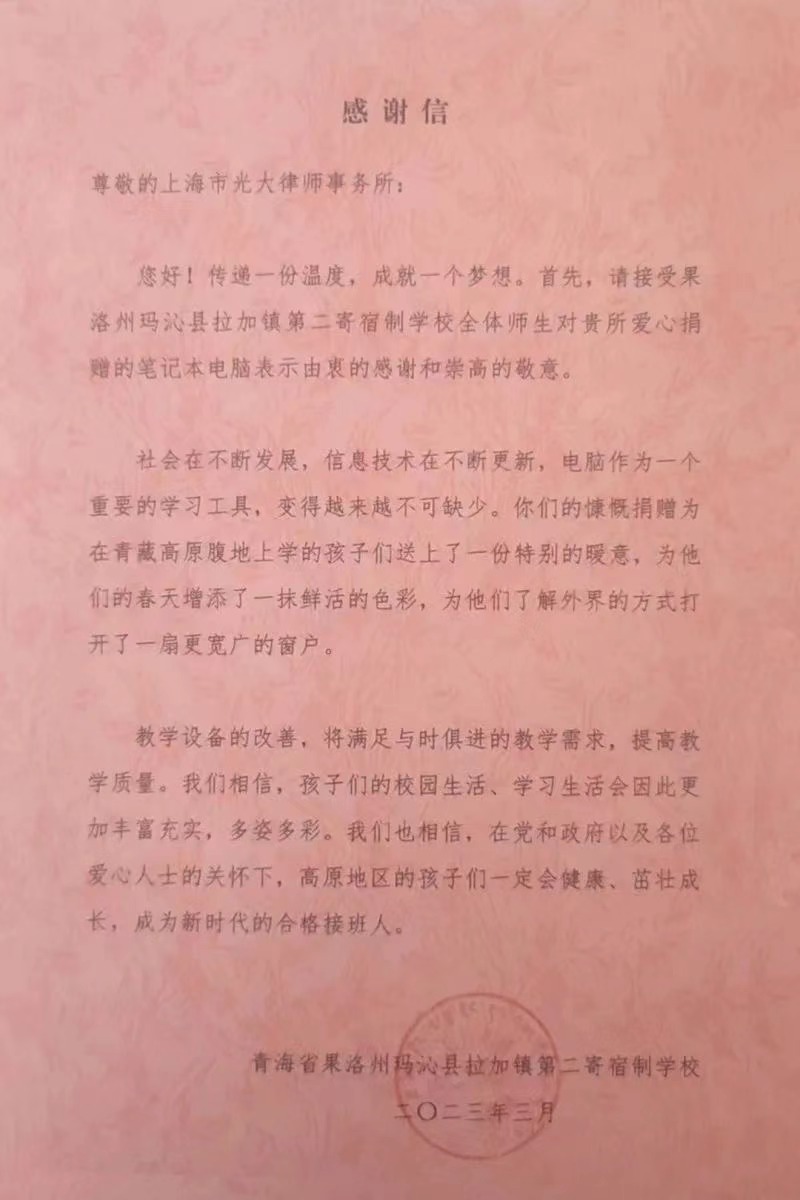 為助力青海省果洛州瑪沁縣牧區教育事業發展,不斷提升牧區學校教學教育質量,在第60個“學雷鋒紀念日”到來之際,上海市光大律師事務所及13名律師在上海援青干部聯絡組瑪沁小組積極協調下,共為拉加鎮第二寄宿學校捐贈電腦21臺。3月2日,上海援青干部聯絡組瑪沁小組會同縣統戰部、縣檢察院在拉加鎮第二寄宿學校舉行對口援助物資捐贈儀式。