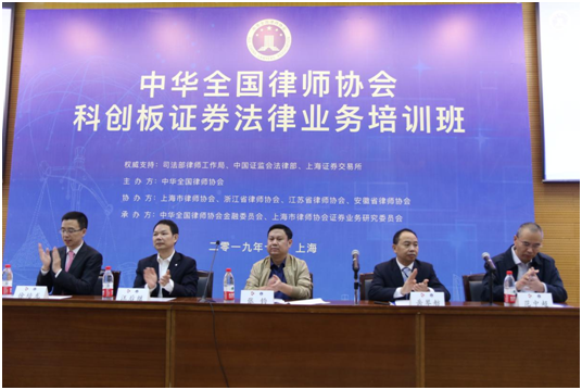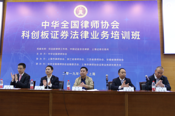 2019年10月19日,在習近平主席宣布在上海設立科創板并試行注冊制一周年到來之際,由中華全國律師協會主辦、上海市律師協會、浙江省律師協會、江蘇省律師協會、安徽省律師協會協辦,中華全國律師協會金融委員會、上海律協證券業務研究委員會承辦的“科創板證券法律業務培訓班”在上海交通大學凱原法學院東方會堂報告廳舉行。這次培訓班得到了司法部律師工作局、中國證監會法律部、發行部和上海證券交易所的大力支持。