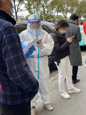 l 達(dá)必誠(chéng)所黨員吳麗霞律師,在靜安區(qū)永和二村做志愿者,主要幫助維護(hù)居民排隊(duì)做核酸的秩序,幫助登記檢測(cè)二維碼,幫助把檢測(cè)試劑交給采樣醫(yī)生。