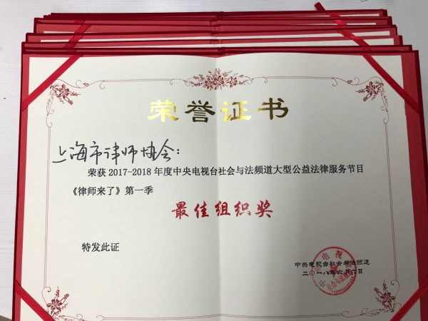 央視《律師來了》節目第一季圓滿結束,總結會上,全國共有150余位律師獲獎,上海律師就有22位。其中,王思維、周文宣、張姍姍、張玉霞、王常棟、嚴嫣、趙山、閆艷、付忠文共9位律師獲“最佳公益獎”,田思遠、楊穎琦、王丹丹、范曉峰、宋安成、彭振華、孫歡成、葉正偉、孫亮、李淑芹、謝向英、郭亮、謝恬共13位律師獲“優秀法律顧問獎”,上海市律師協會獲“最佳組織獎”。