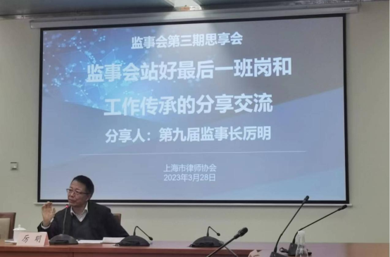 3月28日,第十一屆上海律協監事會舉辦了“站好最后一班崗”第三期“細行律身”思享會。第九屆監事長厲明應邀作為嘉賓出席會議。會議由監事陸國飛主持,監事長張鵬峰,監事孫瑜、顧靖、李明、譚春明、錢軍亮、金冰一、邵開俊參加了會議,上海律協秘書長助理、辦公室主任陶麗萍等列席了會議。