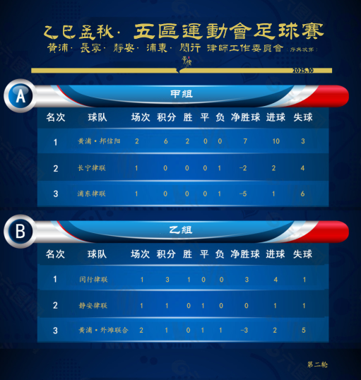 2025年10月22日,2025上海五區律師活力運動匯足球賽迎來第二輪激戰。黃浦·邦信陽、黃浦·外灘聯合繼續出戰迎接浦東律聯與閔行律聯的挑戰。兩場比賽對抗激烈,進球頗多。