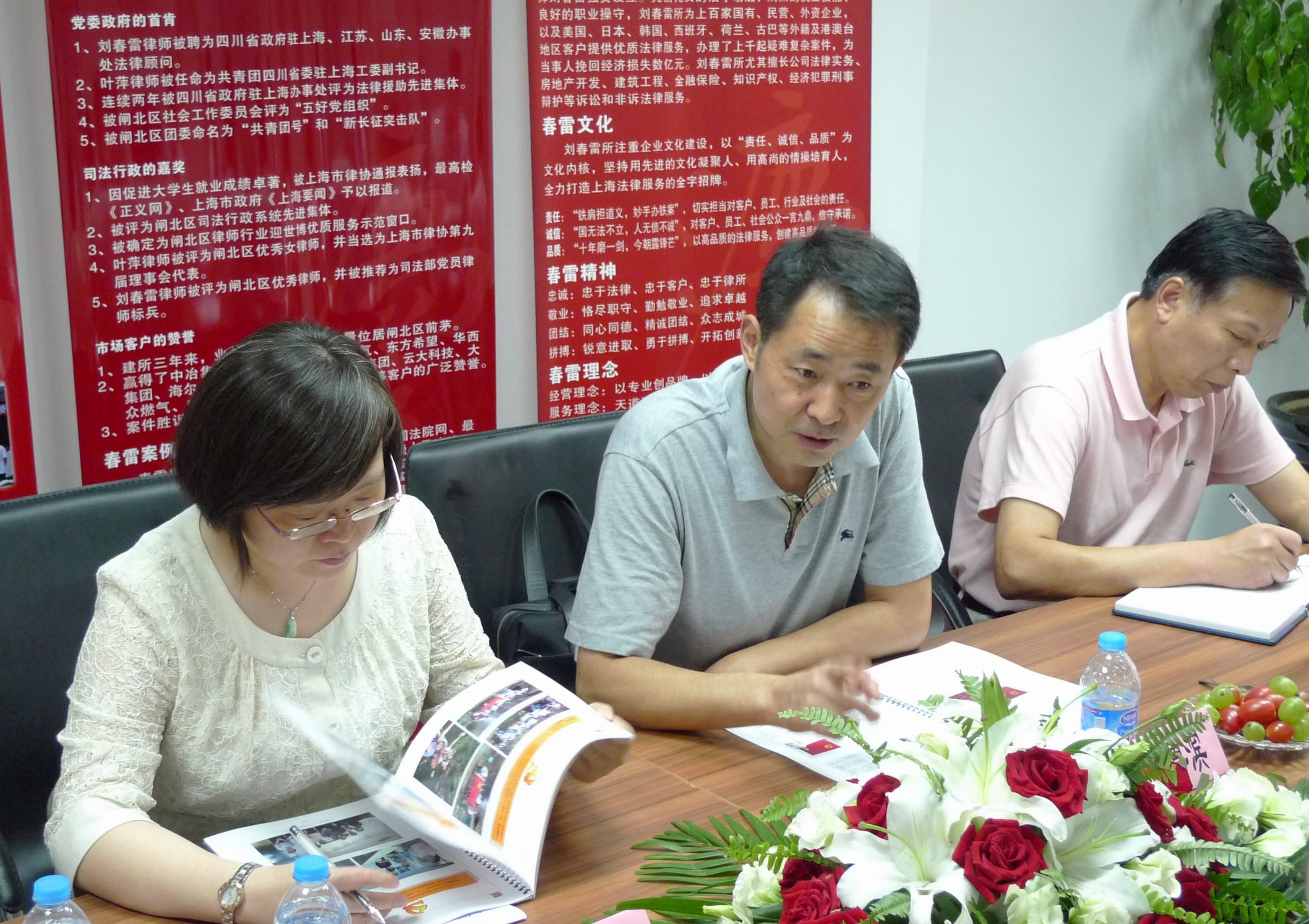 隨后,葉萍書記向張主任一行匯報了春雷所黨建工作的組織建設、制度建設、活動開展和工作成果。當聽到春雷所黨支部被確定為閘北區律師系統爭先創優示范支部、被評為閘北區兩新組織“五好”黨組織時,張主任露出了欣慰喜悅的神情。劉春雷主任重點匯報了春雷所的文化建設和品牌建設,張主任十分贊賞春雷所“責任、誠信、品質”的核心價值觀和規范化、專業化、品牌化的科學發展之路。