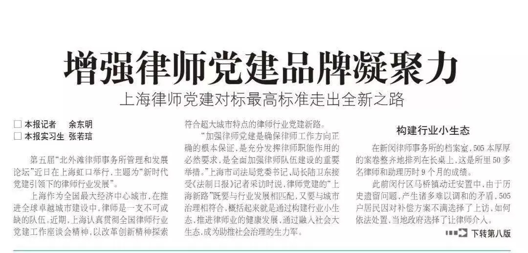 今日(9月14日),《法制日報》在頭版報眼刊發《增強律師黨建品牌凝聚力》一文,報道律師黨建的“上海之路”。