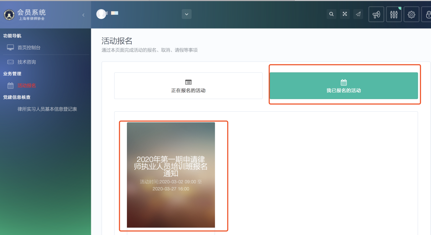 4、點擊“已報名活動”,選擇“2021年第二期申請律師執業人員培訓班”,點擊“繳費”;