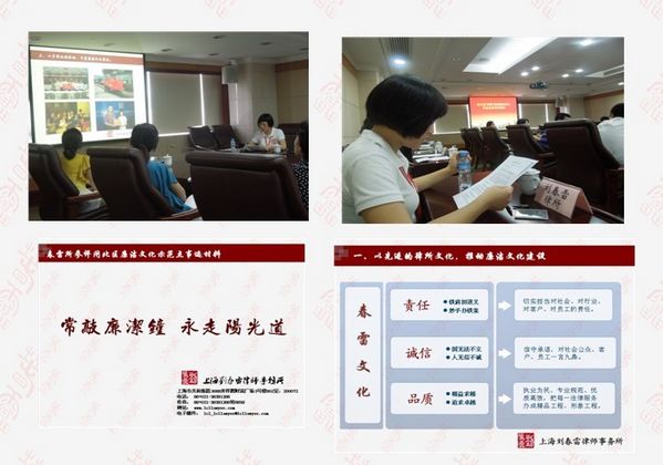 短短三年多時間,春雷所從最初的2名律師發展為12名律師和6名律師助理及管理人員,突破了個人所發展的瓶頸,實現了人員規模、業務量名列上海市264家個人所前茅的發展目標。但凡視察、到訪過春雷所的領導及客戶,都會被春雷所蓬勃的朝氣、昂揚的銳氣和清廉的正氣吸引和感染,這一切都得益于春雷所的文化建設。2012年7月,春雷所代表閘北區司法行政系統參選閘北區首批廉潔文化示范點。
