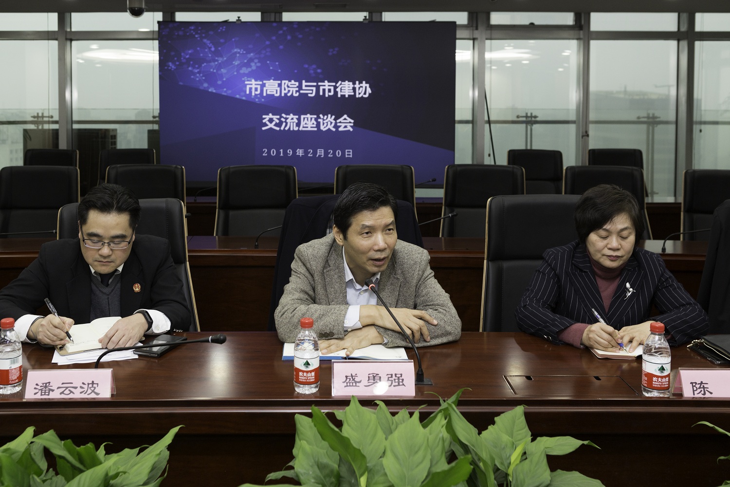 2019年2月20日上午,市高院黨組副書記、副院長盛勇強、副院長陳萌及相關庭室負責同志赴市律協進行交流座談。市司法局副局長王協、副局長羅培新、律師工作管理處副處長張銘、市律協會長俞衛鋒、秘書長忻峰參加了此次座談。
